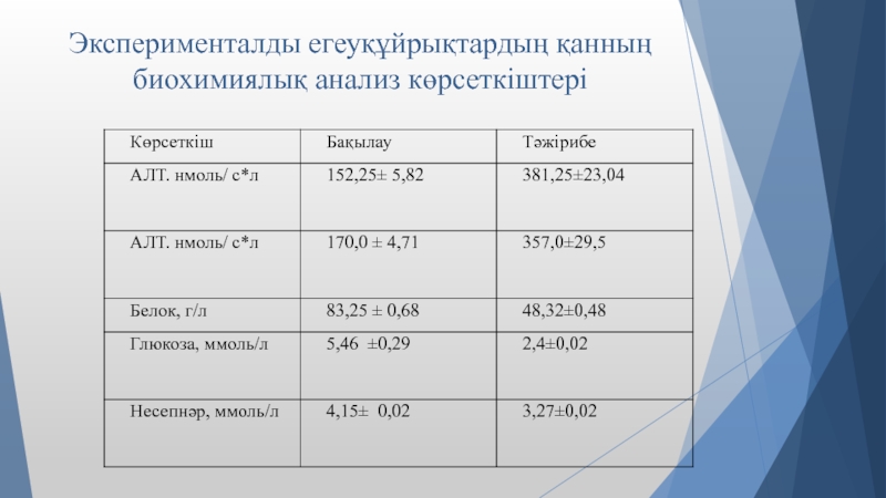 Слайд 13Эксперименталды егеуқұйрықтардың қанның биохимиялық анализ көрсеткіштері