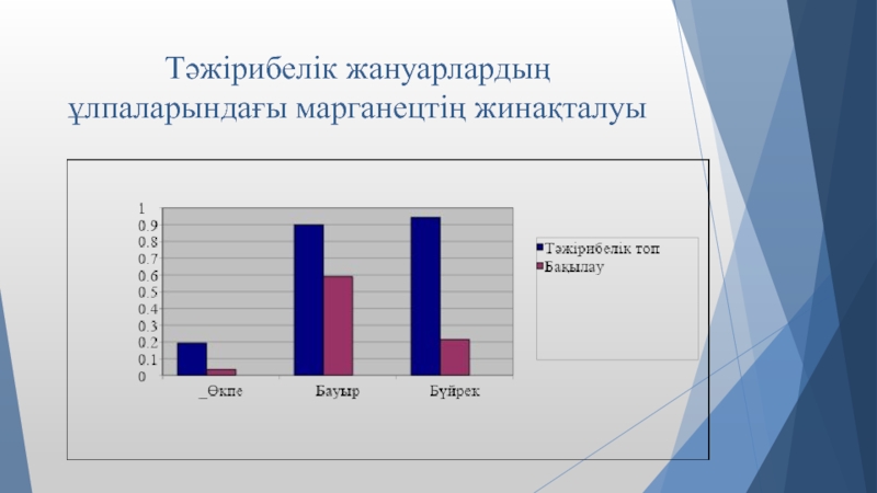 Слайд 19Тәжірибелік жануарлардың ұлпаларындағы марганецтің жинақталуы