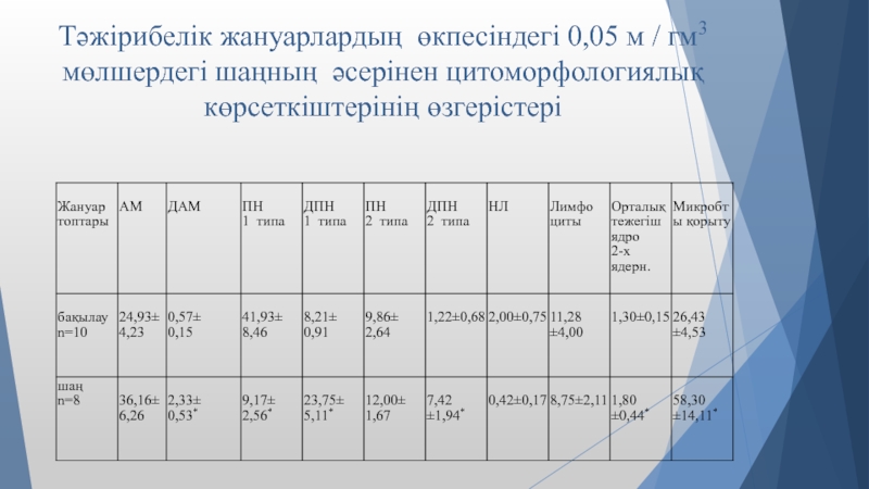 Слайд 14Тәжірибелік жануарлардың өкпесіндегі 0,05 м / гм3 мөлшердегі шаңның әсерінен