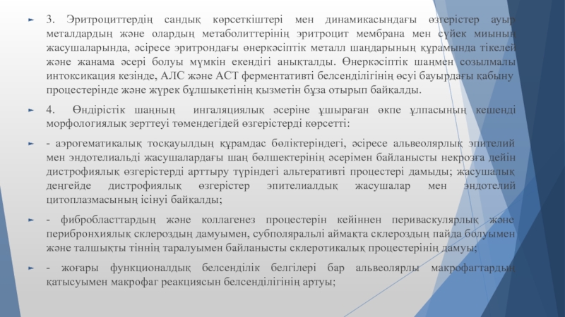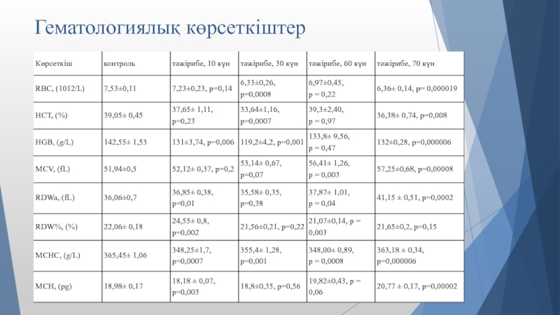 Слайд 213. Эритроциттердің сандық көрсеткіштері мен динамикасындағы өзгерістер ауыр металдардың және