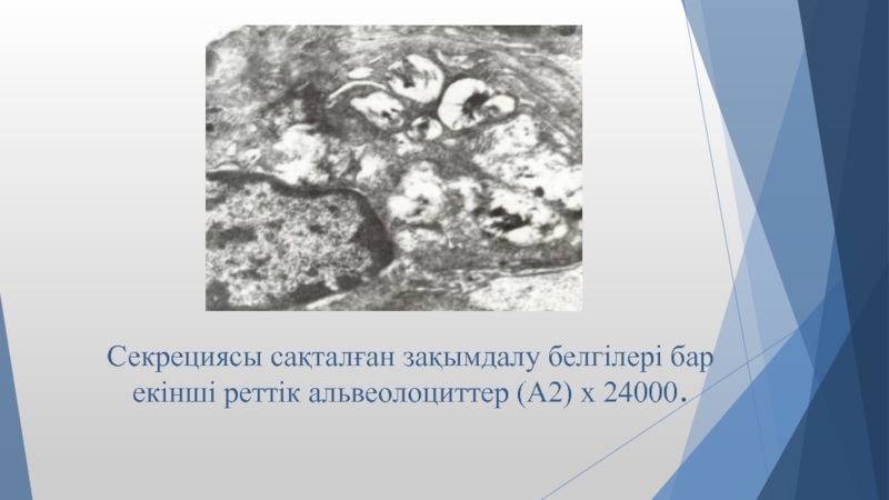 Слайд 16Секрециясы сақталған зақымдалу белгілері бар екінші реттік альвеолоциттер (А2) х