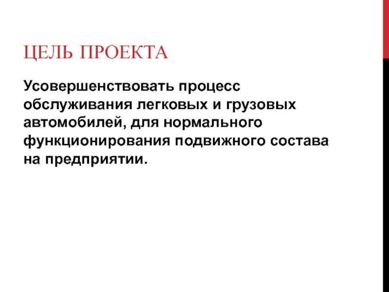 Цель проектаУсовершенствовать процесс обслуживания легковых и грузовых автомобилей, для нормального функционирования подвижного состава на предприятии.