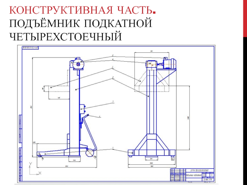 Слайд 6Конструктивная часть. Подъёмник подкатной четырехстоечный