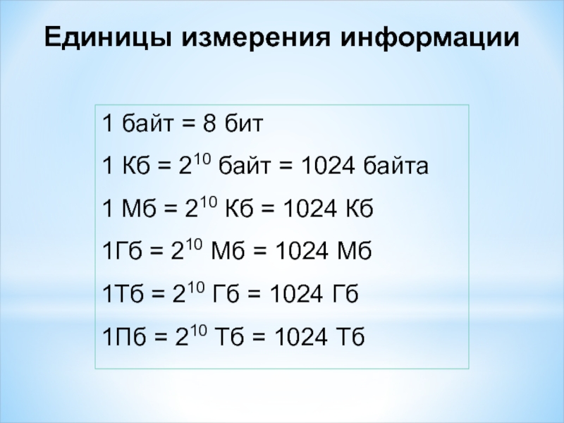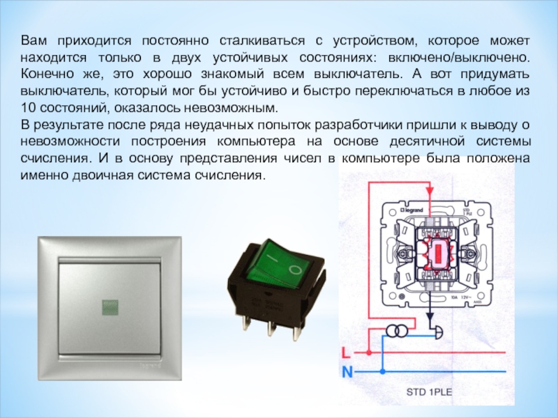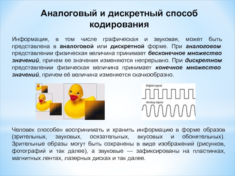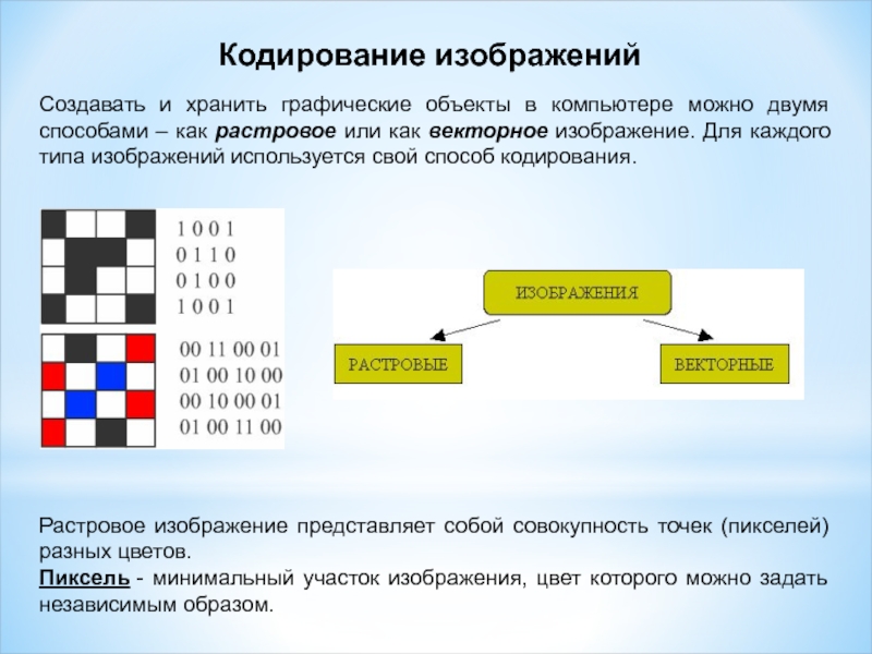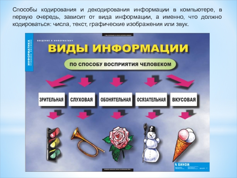 принято называть двоичными цифрами или битами. С помощью двух цифр 0 и 1 можно закодировать любое сообщение. Это явилось причиной того, что в компьютере обязательно должно быть организованно два важных процесса: кодирование и декодирование.Кодирование – преобразование входной информации в форму, воспринимаемую компьютером, т.е. двоичный код.
