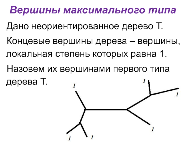 Вершины максимального типаДано неориентированное дерево Т.Концевые вершины дерева – вершины, локальная степень которых равна 1.Назовем их вершинами