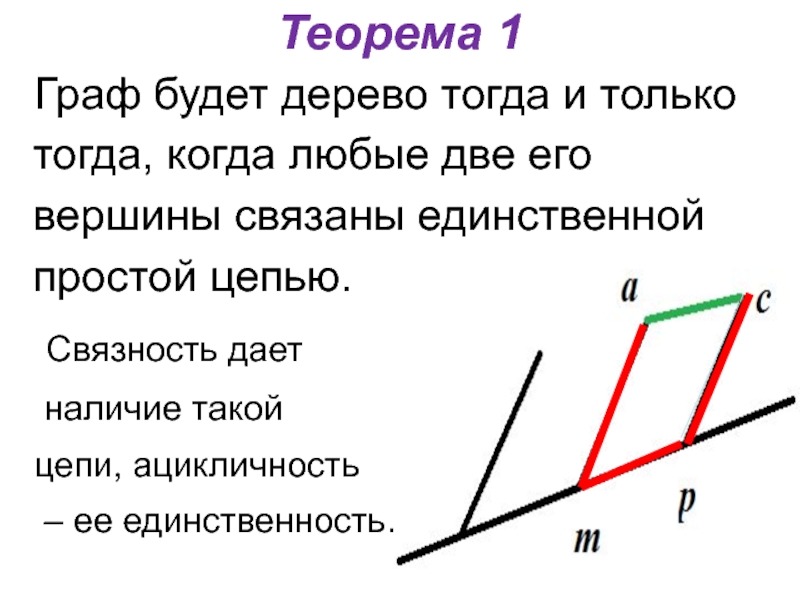 Теорема 1Граф будет дерево тогда и только тогда, когда любые две его вершины связаны единственной простой цепью.