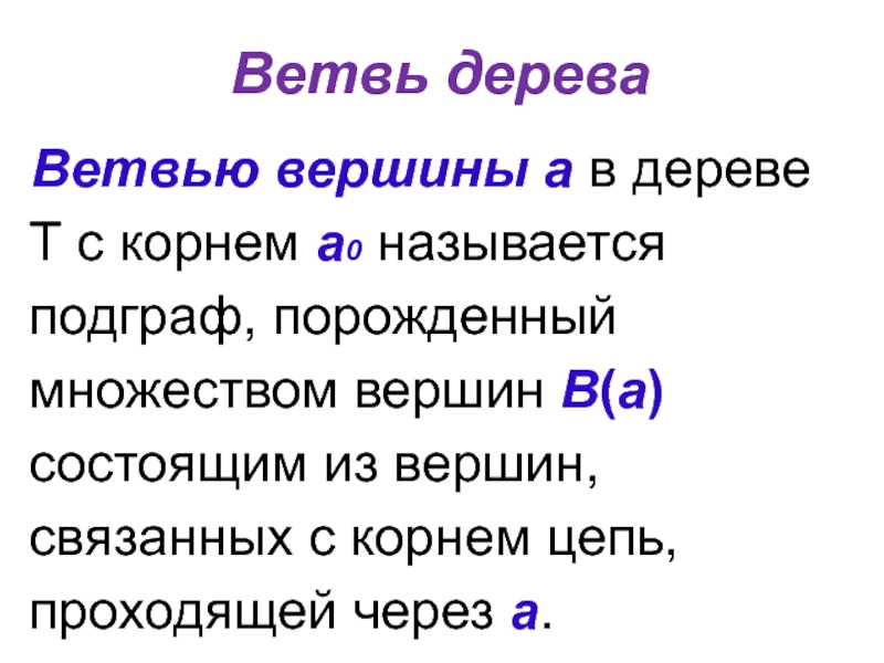 Ветвь дереваВетвью вершины а в дереве Т с корнем а0 называется подграф, порожденный множеством вершин В(а) состоящим