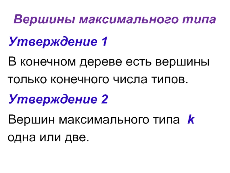 Вершины максимального типаУтверждение 1В конечном дереве есть вершины только конечного числа типов.Утверждение 2Вершин максимального типа k одна