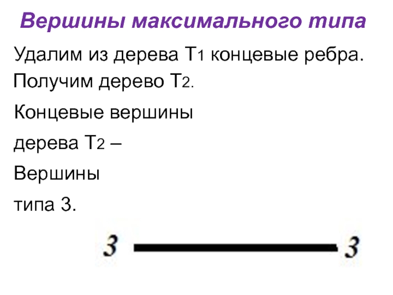 Вершины максимального типаУдалим из дерева Т1 концевые ребра. Получим дерево Т2. Концевые вершиныдерева Т2 – Вершинытипа 3.