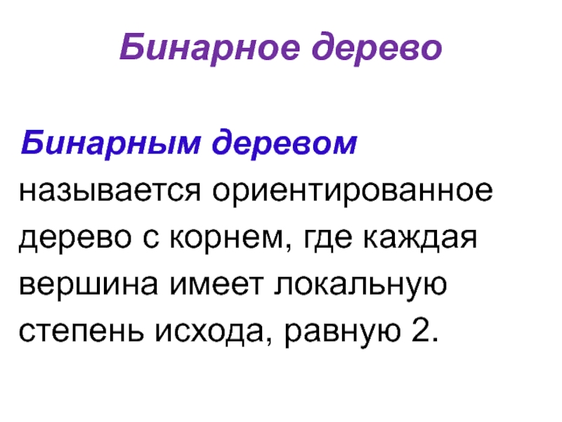 Бинарное деревоБинарным деревом называется ориентированное дерево с корнем, где каждая вершина имеет локальную степень исхода, равную 2.