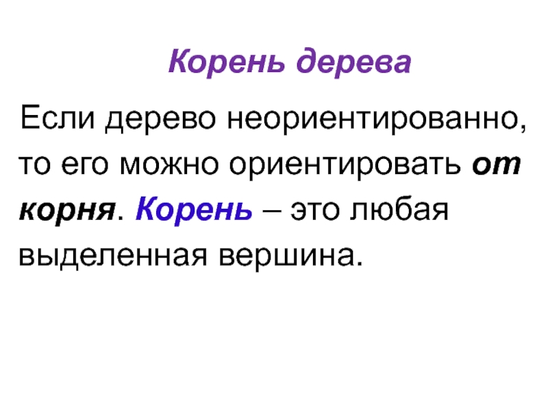 Корень дереваЕсли дерево неориентированно, то его можно ориентировать от корня. Корень – это любая выделенная вершина.