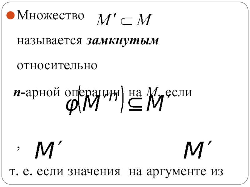 где n – арность операции. Операция замкнута относительно множества М по определению, т. е. операция над элементами множества М, и результат тоже элемент М.