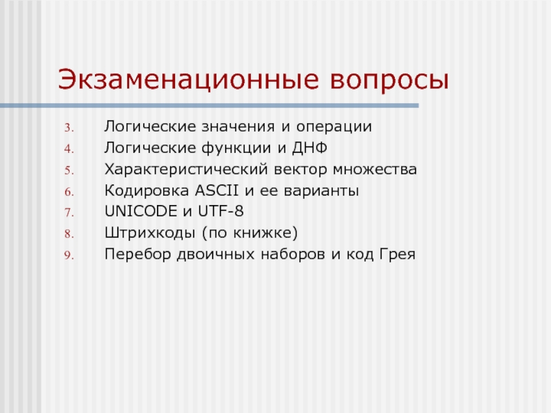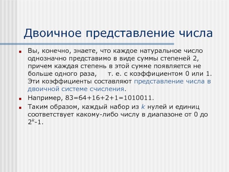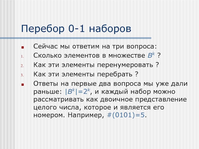 Ответы на первые два вопроса мы уже дали раньше: |Bk|=2k, и каждый набор можно рассматривать как двоичное представление целого числа, которое и является его номером. Например, #(0101)=5.