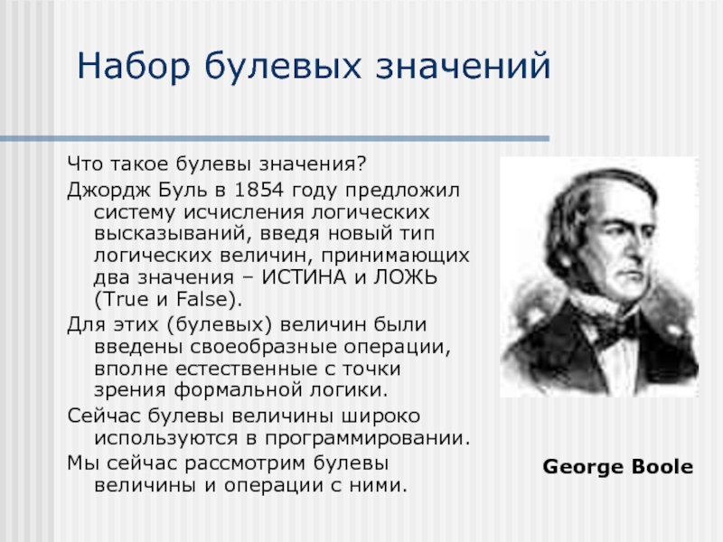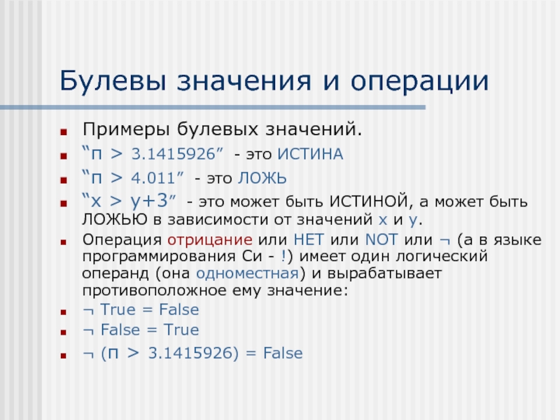Мы сейчас рассмотрим булевы величины и операции с ними.