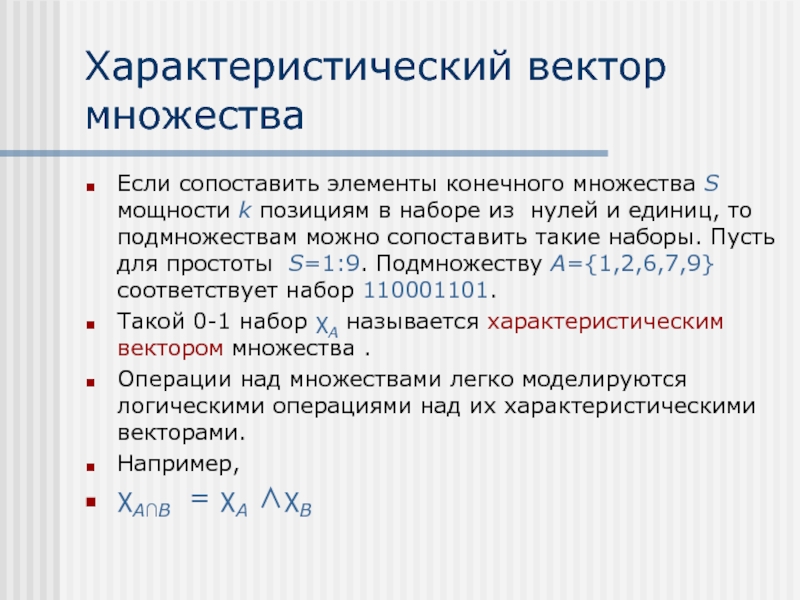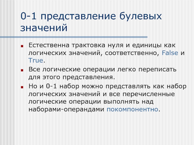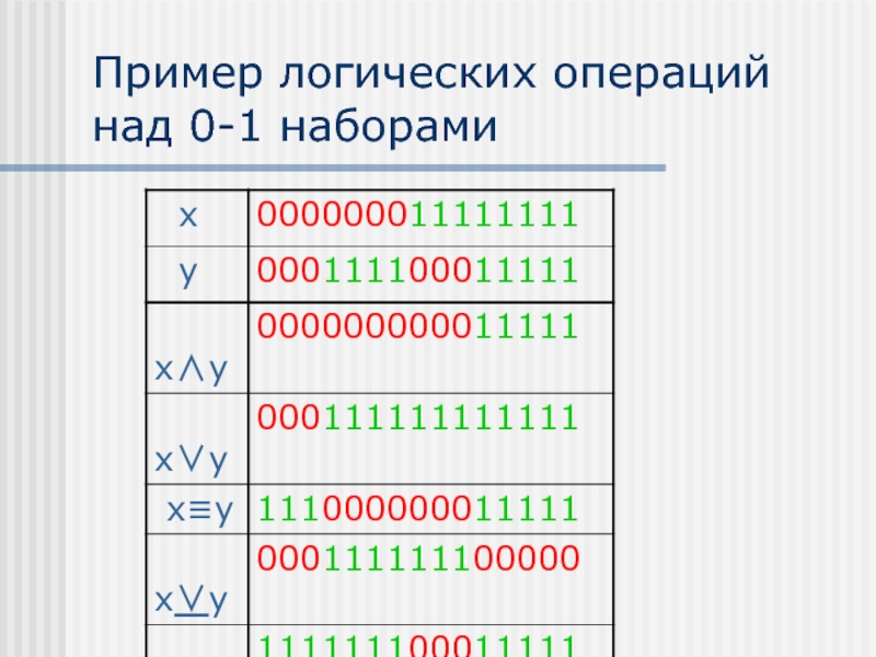 Но и 0-1 набор можно представлять как набор логических значений и все перечисленные логические операции выполнять над наборами-операндами покомпонентно.