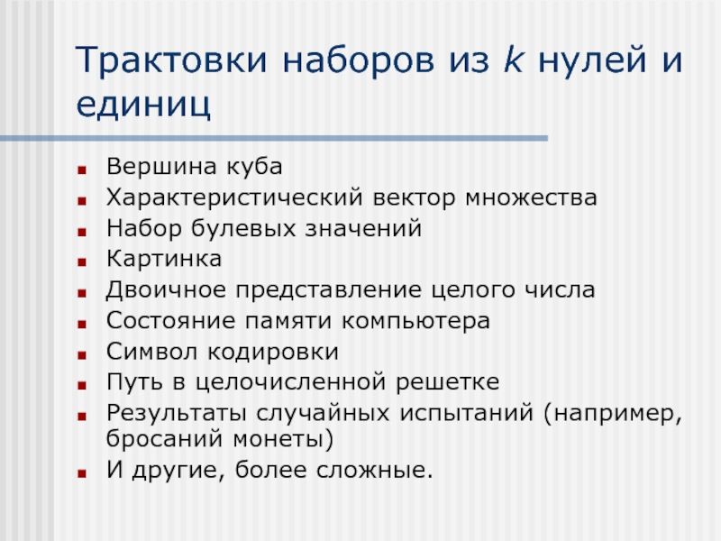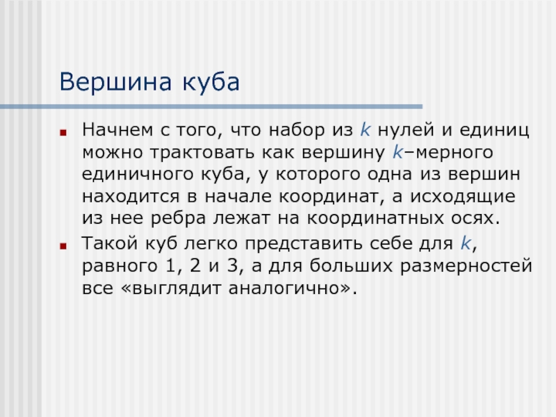 единиц можно трактовать как вершину k–мерного единичного куба, у которого