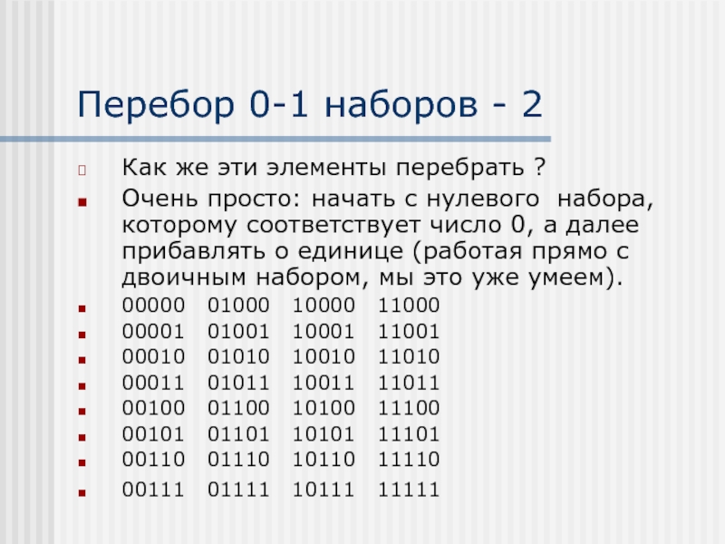 Значит, нужно иметь два рабочих 0-1 набора. В первом моделировать прибавление 1, а во втором, зная позицию изменения, менять значение бита.