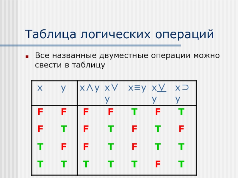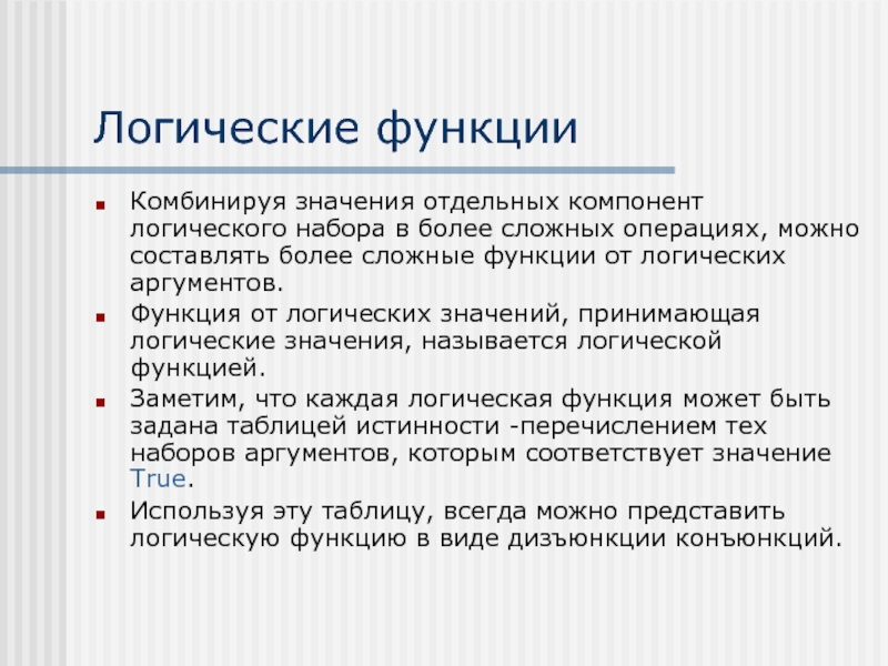 Заметим, что каждая логическая функция может быть задана таблицей истинности -перечислением тех наборов аргументов, которым соответствует значение True.