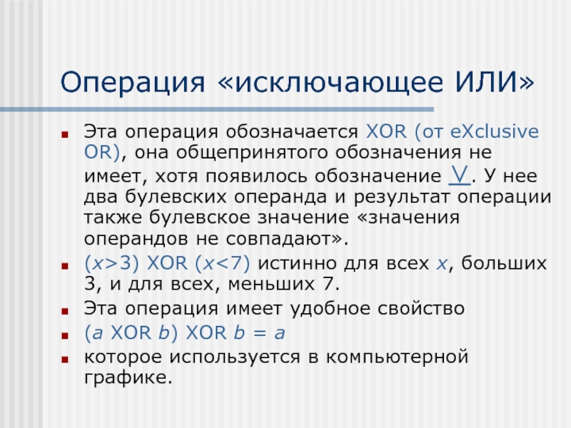 два булевских операнда и результат операции также булевское значение «значения операндов не совпадают».