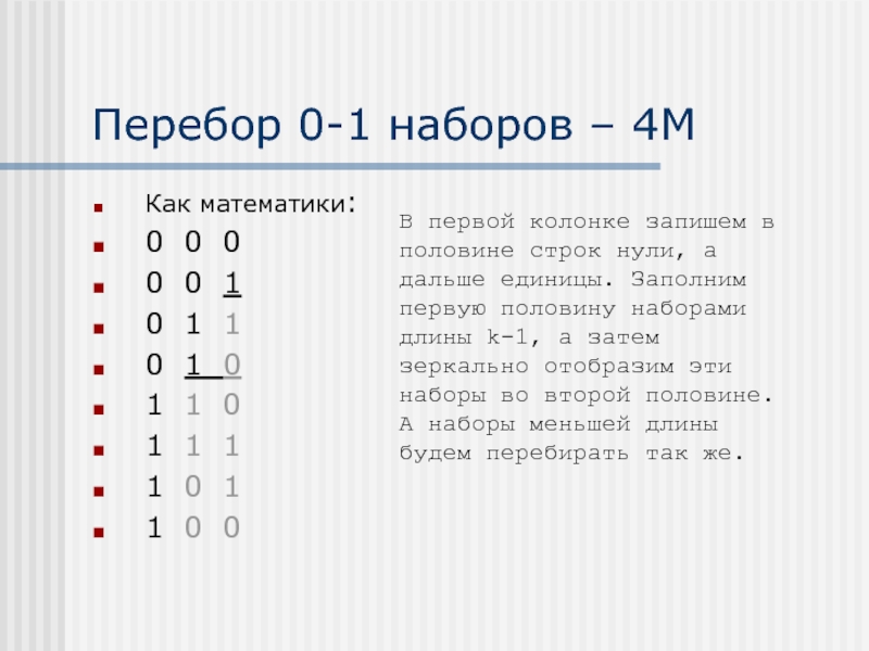 В первой колонке запишем в половине строк нули, а дальше единицы. Заполним первую половину наборами длины k-1, а затем зеркально отобразим эти наборы во второй половине. А наборы меньшей длины будем перебирать так же.