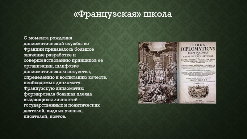 «Французская» школаС момента рождения дипломатической службы во Франции придавалось большое значение разработке и совершенствованию принципов ее организации,