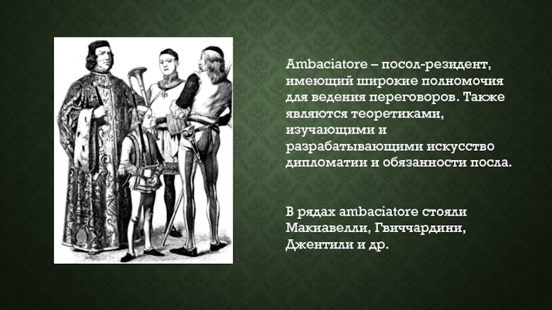 рядах ambaciatore стояли Макиавелли, Гвиччардини, Джентили и др.