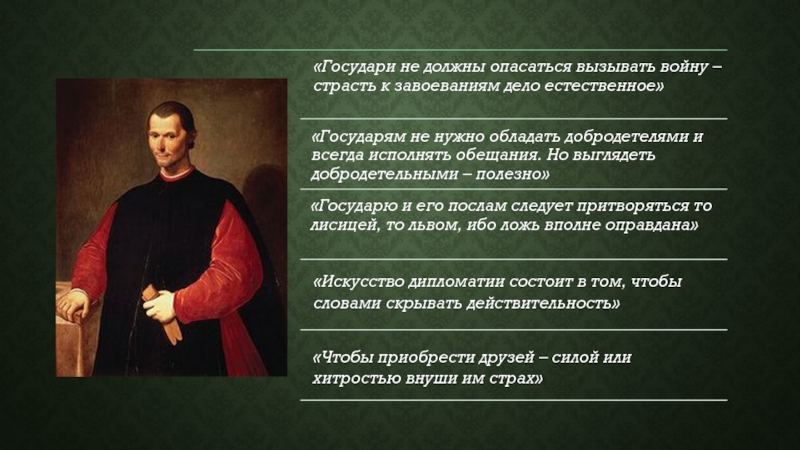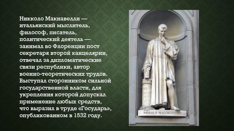 связи республики, автор военно-теоретических трудов. Выступал сторонником сильной государственной власти, для укрепления которой допускал применение любых средств, что выразил в труде «Государь», опубликованном в 1532 году.