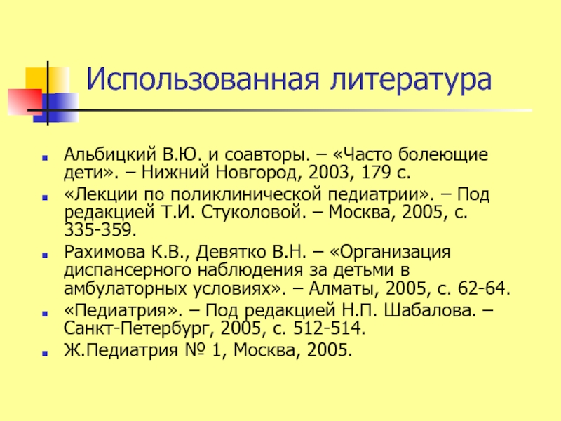 Рахимова К.В., Девятко В.Н. – «Организация диспансерного наблюдения за детьми в амбулаторных условиях». – Алматы, 2005, с. 62-64.