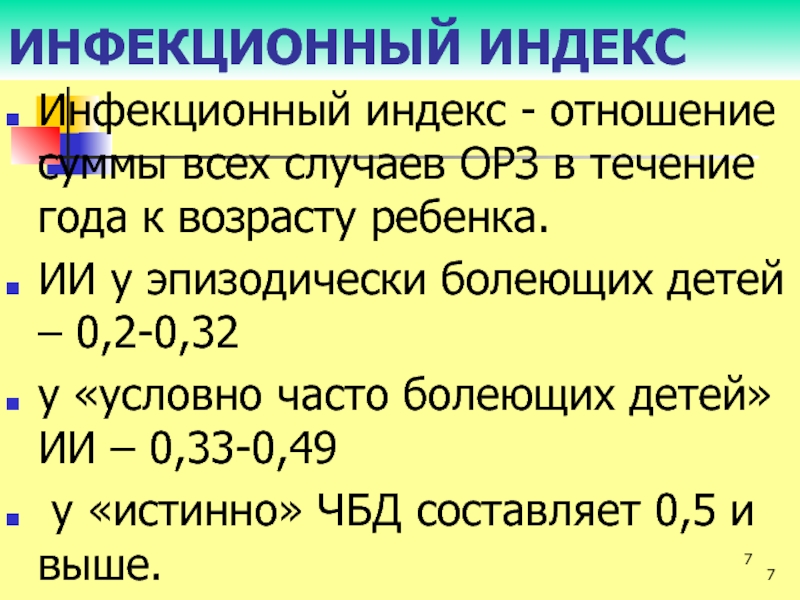 Слайд 7Инфекционный индекс - отношение суммы всех случаев ОРЗ в течение