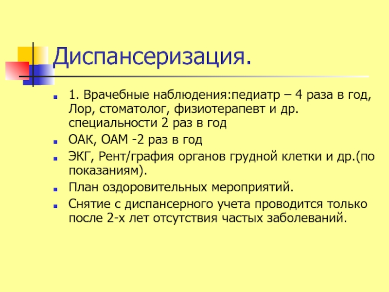 1. Врачебные наблюдения:педиатр – 4 раза в год, Лор, стоматолог,