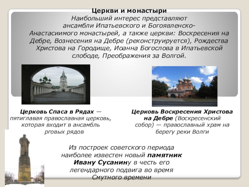 Наибольший интерес представляют ансамбли Ипатьевского и Богоявленско-Анастасиимого монастырей, а также церкви: Воскресения на Дебре, Вознесения на Дебре (реконструируется), Рождества Христова на Городище, Иоанна Богослова в Ипатьевской слободе, Преображения за Волгой.
