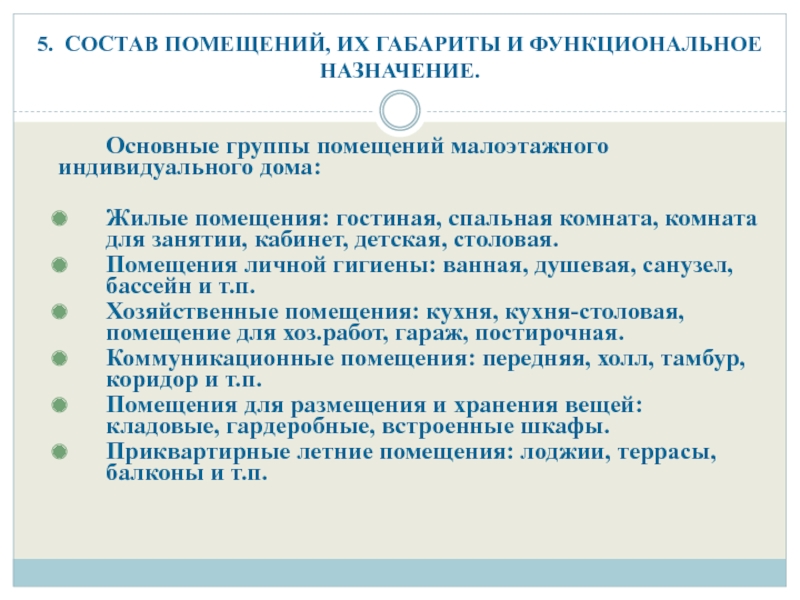 Слайд 105. СОСТАВ ПОМЕЩЕНИЙ, ИХ ГАБАРИТЫ И ФУНКЦИОНАЛЬНОЕ НАЗНАЧЕНИЕ.