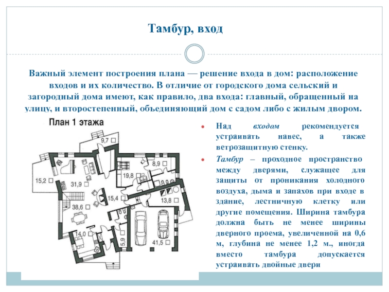 Слайд 11Важный элемент построения плана — решение входа в дом: расположение