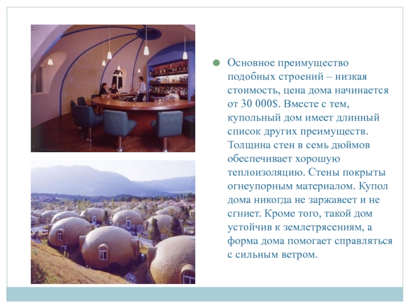 список других преимуществ. Толщина стен в семь дюймов обеспечивает хорошую теплоизоляцию. Стены покрыты огнеупорным материалом. Купол дома никогда не заржавеет и не сгниет. Кроме того, такой дом устойчив к землетрясениям, а форма дома помогает справляться с сильным ветром.
