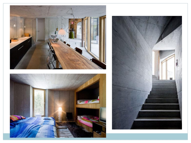 Вход в дом выполнен в виде овальной прорези. Большие окна делают дом заметным. Лестницы сделаны из камня. Архитектор – Кристиан Мюллер.