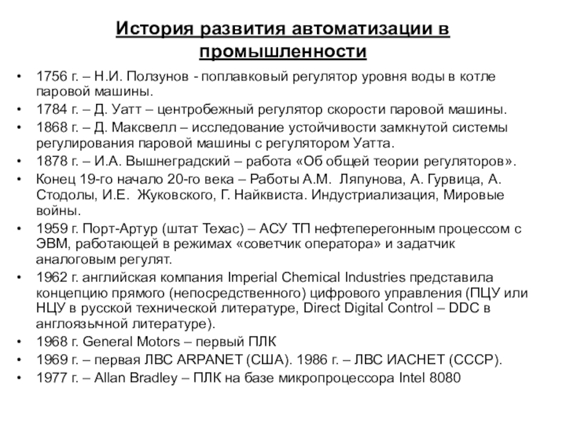 1868 г. – Д. Максвелл – исследование устойчивости замкнутой системы регулирования паровой машины с регулятором Уатта.