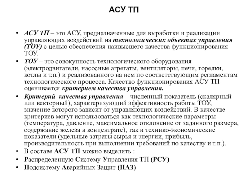 ТОУ – это совокупность технологического оборудования (электродвигатели, насосные агрегаты, вентиляторы, печи, горелки, котлы и т.п.) и реализованного на нем по соответствующим регламентам технологического процесса. Качество функционирования АСУ ТП оценивается критерием качества управления.