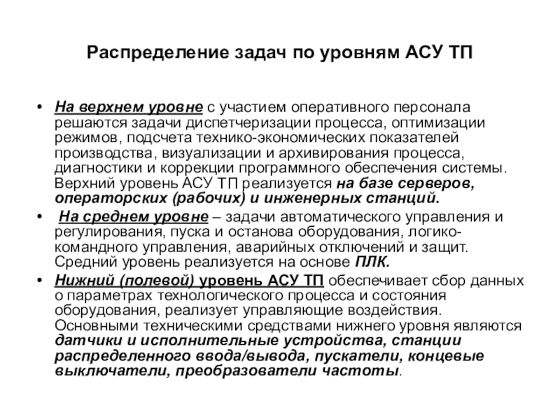 На среднем уровне – задачи автоматического управления и регулирования, пуска и останова оборудования, логико-командного управления, аварийных отключений и защит. Средний уровень реализуется на основе ПЛК.