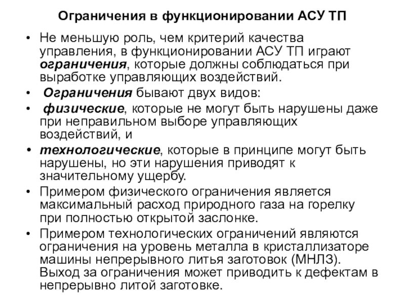 управления, в функционировании АСУ ТП играют ограничения, которые должны соблюдаться