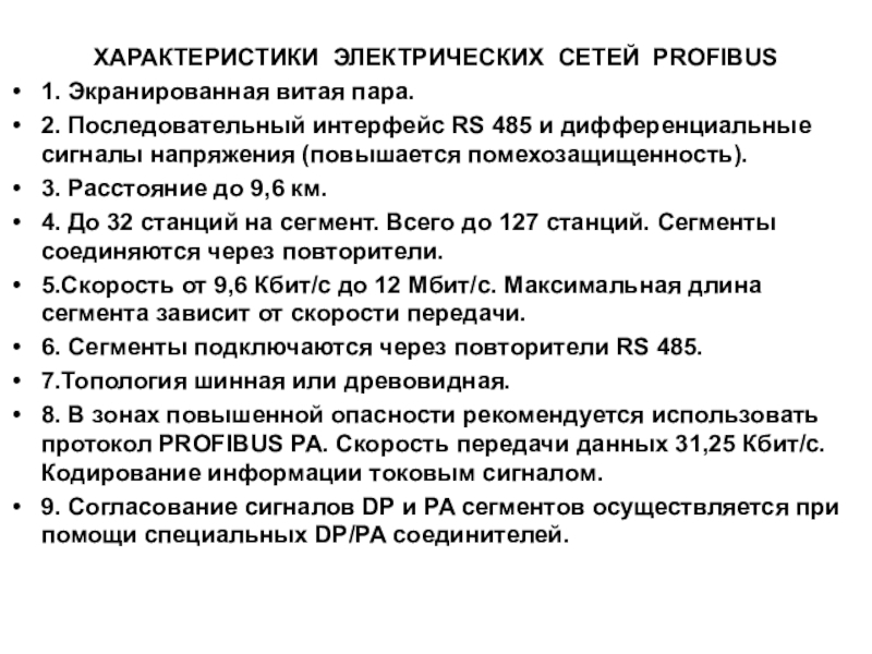 Слайд 42ХАРАКТЕРИСТИКИ ЭЛЕКТРИЧЕСКИХ СЕТЕЙ PROFIBUS