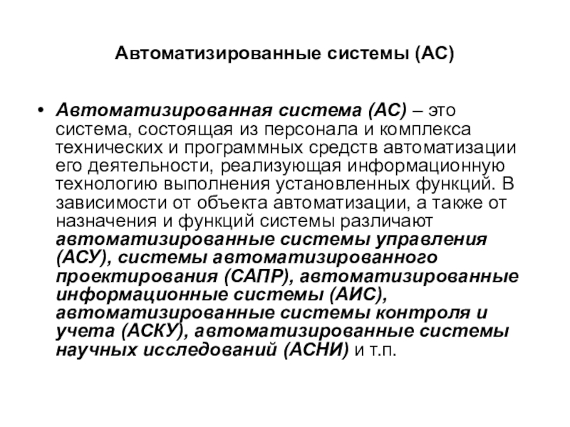 реализующая информационную технологию выполнения установленных функций. В зависимости от объекта автоматизации, а также от назначения и функций системы различают автоматизированные системы управления (АСУ), системы автоматизированного проектирования (САПР), автоматизированные информационные системы (АИС), автоматизированные системы контроля и учета (АСКУ), автоматизированные системы научных исследований (АСНИ) и т.п.