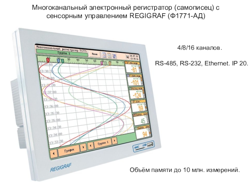 Слайд 49Многоканальный электронный регистратор (самописец) с сенсорным управлением REGIGRAF (Ф1771-АД)