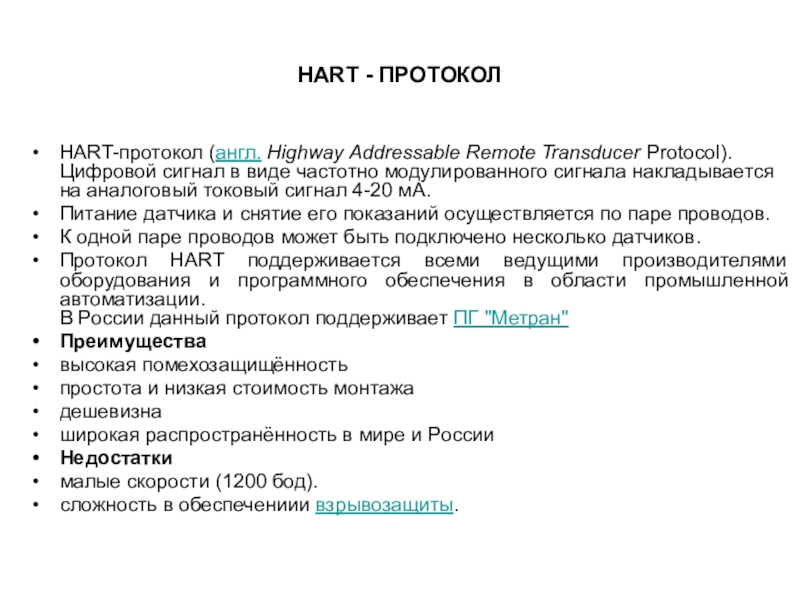 HART-протокол (англ. Highway Addressable Remote Transducer Protocol). Цифровой