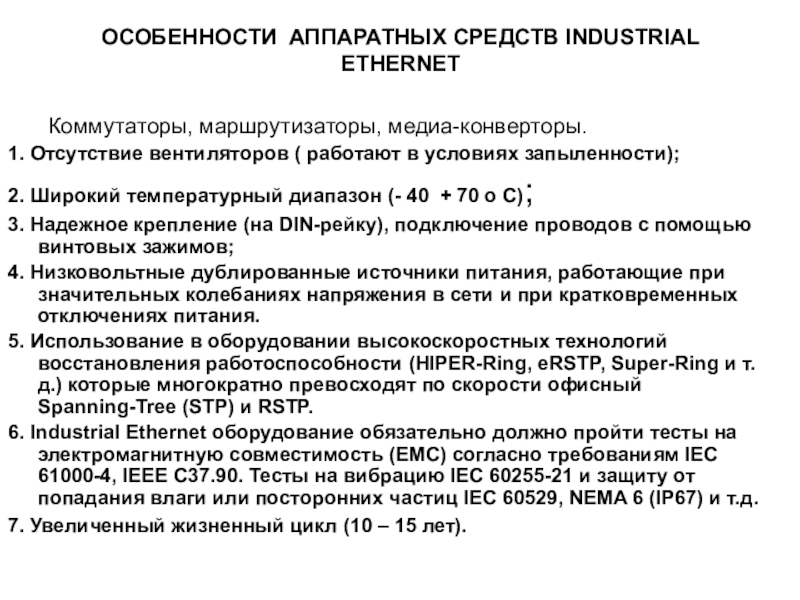 Слайд 45ОСОБЕННОСТИ АППАРАТНЫХ СРЕДСТВ INDUSTRIAL ETHERNET
