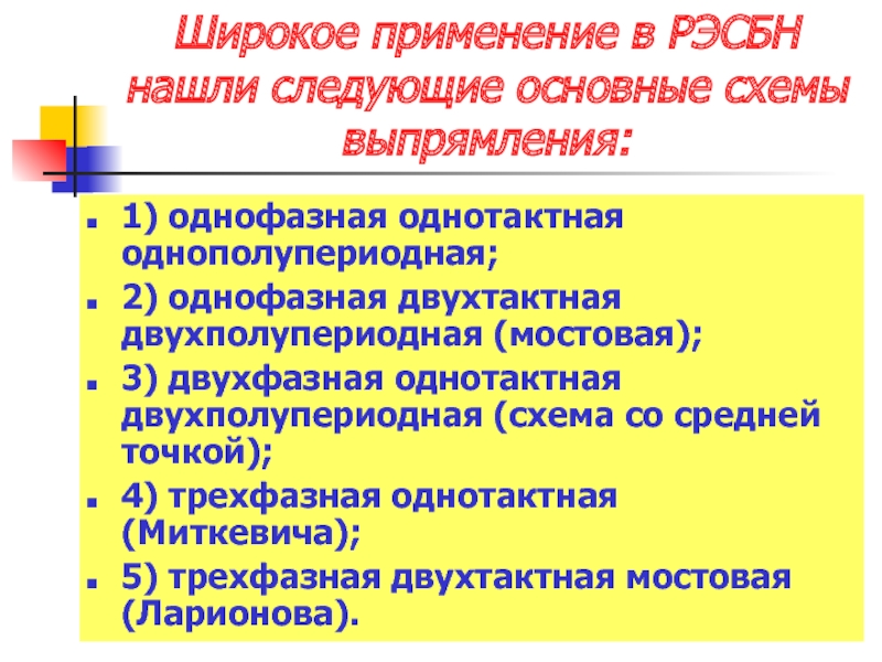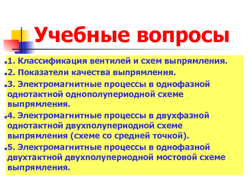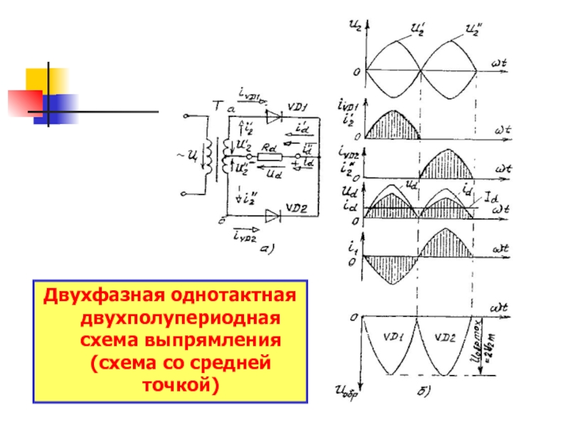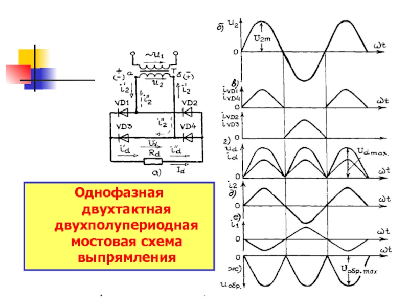 в двухфазной однотактной двухполупериодной схеме выпрямления (схеме со средней точкой).5. Электромагнитные процессы в однофазной двухтактной двухполупериодной мостовой схеме выпрямления.