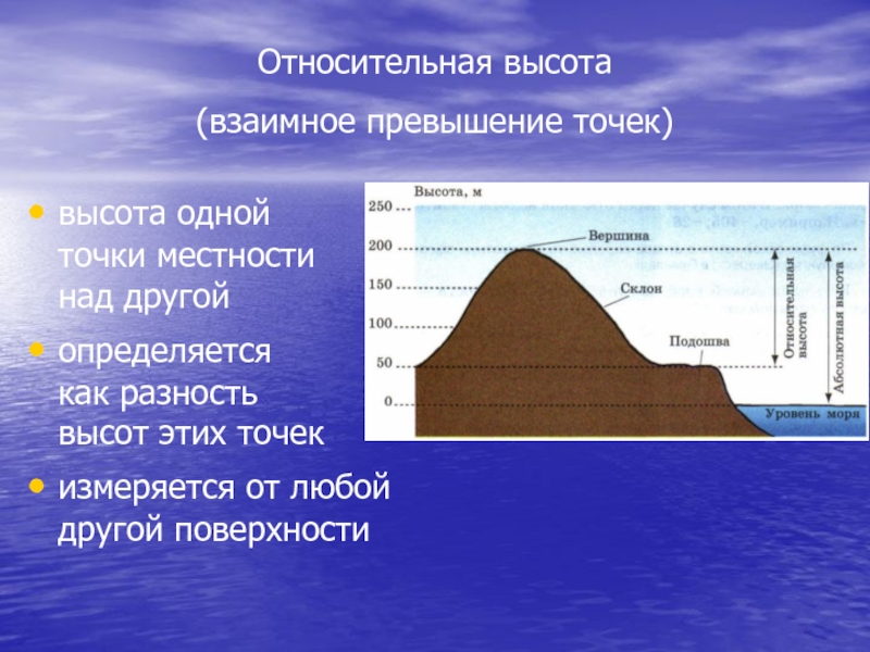 точки, лежащей выше уровня океана, считается положительной, ниже – отрицательной (например, уровень Каспийского моря равен «минус»28 м)