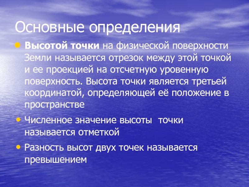 этой точкой и ее проекцией на отсчетную уровенную поверхность. Высота
