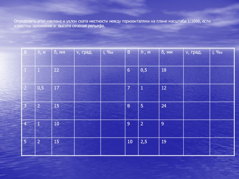 Слайд 16Определить угол наклона и уклон ската местности между горизонталями на