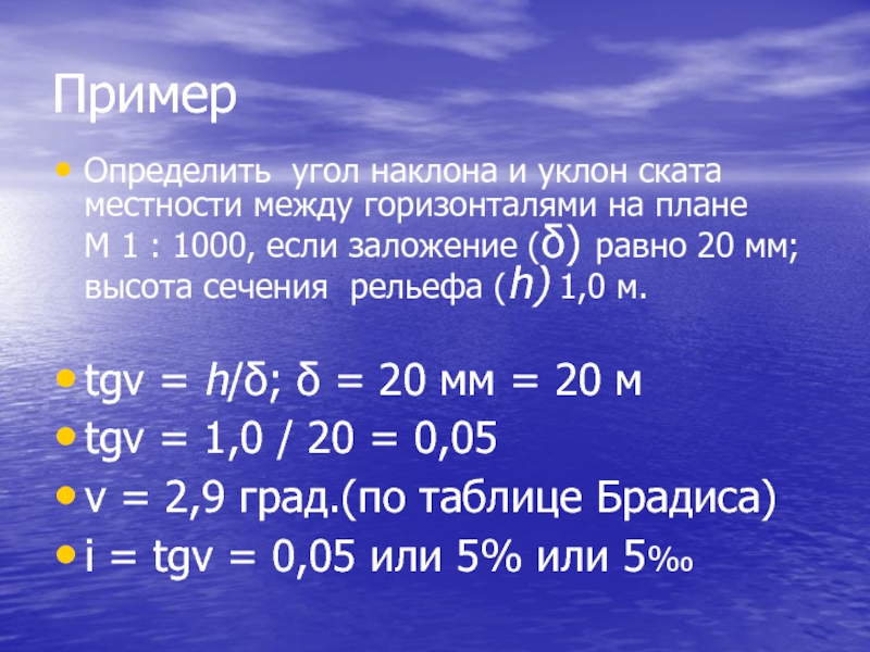 где h - высота сечения рельефа, δ – заложение (расстояние между смежными горизонталями на карте, зависящее от принятой высоты сечения рельефа на данной карте и крутизны ската в данном месте).