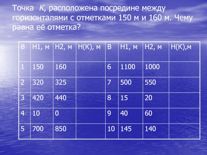 Слайд 15Точка К, расположена посредине между горизонталями с отметками 150 м